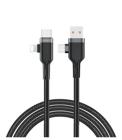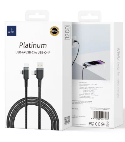 5 509 CFACâble multi-ports WiWU Platinum (USB-A/USB-C vers USB-C/Lightning), 100W/30W, 1,2m, tressé, charge rapide, certifié CE/FCC/ROHS.