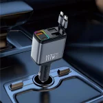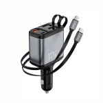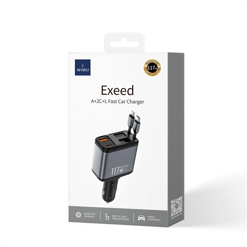 Chargeur de voiture WiWU Exeed 200W (117W réels) avec câbles rétractables indépendants (Type-C + Lightning) et multiples protocoles de charge.